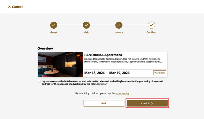Simply enter your reservation number and last name at the check-in terminal. You can find this information in the email with the subject line “Booking Confirmed: …” that you received from us.