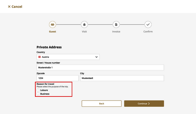 - During the check-in process, select “Business Trip” as the reason for your stay and enter your preferred billing address directly.