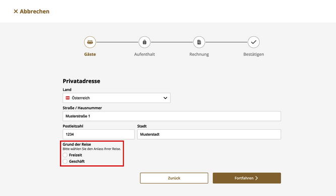 Tragen Sie Ihre Meldedaten ein. Sie können eine FIRMENANSCHRIFT hinterlegen, sofern Sie eine Dienstreise machen. Falls Sie das nicht benötigen, können Sie direkt zu SCHRITT 4 gehen.