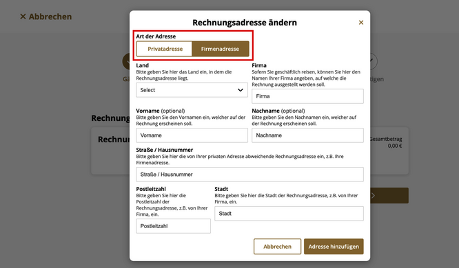 Wählen Sie ganz oben bei "Art der Adresse" die Option "Firmenadresse" aus und füllen Sie alle Daten aus. Zur Bestätigung klicken Sie auf den "Adresse hinzufügen"-Button und Sie haben erfolgreich die Rechnungsadresse geändert.