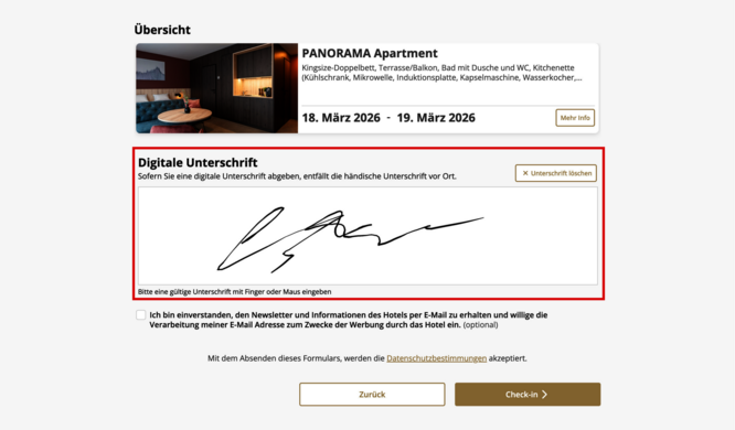 Unterschreiben Sie im Feld "Digitale Unterschrift" und gehen Sie auf den "Check-In"-Button.
